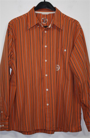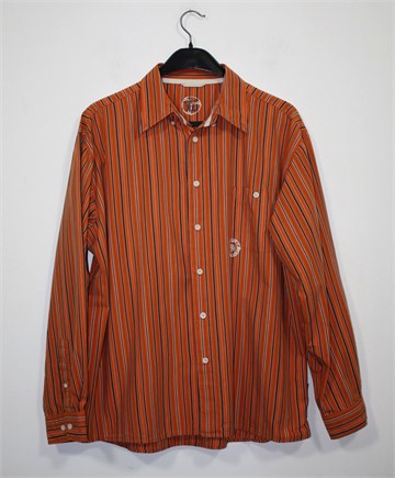 Timeout košulja sa dugim rukavima, tamnije narančaste boje sa prugama. Prednje kopčanje, džepić i aplikacija na prsima. Kvalitetan i nerastezljiv pamuk. Nešto duža sa stražnje strane.