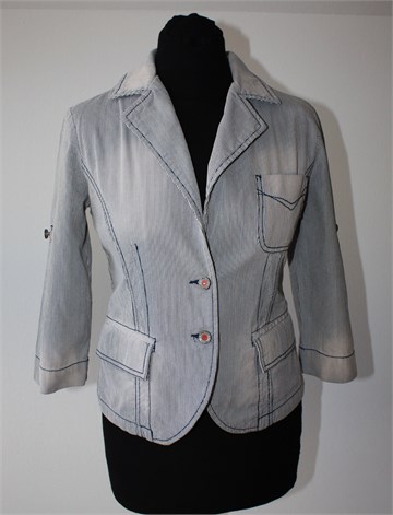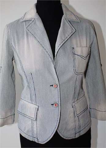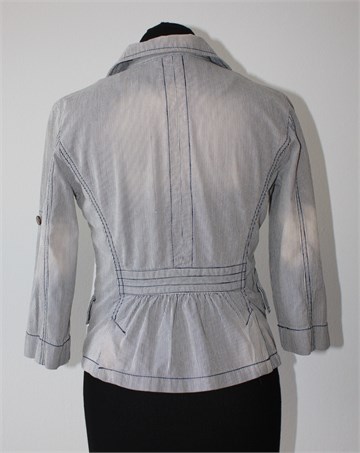 Timeout jakna sa poludugim rukavima (mogu se nositi i kao kraći - gumbić sa vanjske strane rukava i vezica unutar rukava), prugasta kombinacija bijele i plave boje. Jakna mjestimično ima isprani izgled (tvornički used look). Prednje kopčanje, bočni džepići sa preklopom i jedan džepić na prsima. Tanja i lagana.