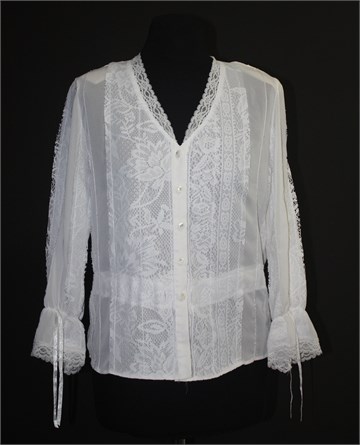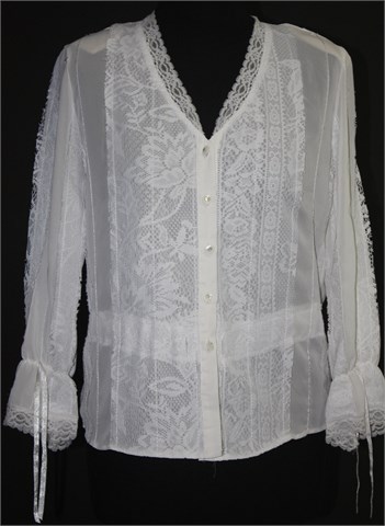 Tina Bis košulja/bluza sa poludugim rukavima, bijele boje sa detaljima od čipke i ukrasnim prošivima sa šljokicama. Prednje kopčanje, stegnuta gumicom na krajevima rukava. U struku je bila vezica koja je skinuta (može se uvesti neka satenska kao što je na rukavima). Lagana, prozračna i prozirna. Jastučići u ramenima (mogu se odšiti).