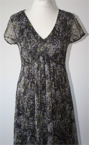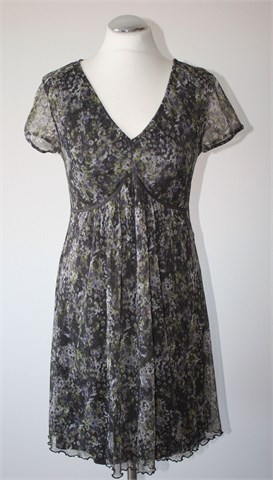 Tom Tailor haljina sa kratkim rukavima, sive boje sa cvjetnim printom (vidljivo na slikama). Sitni, mrežasti materijal, podstavljena (osim rukava). Tanja i lagana, rastezljiva.