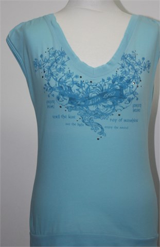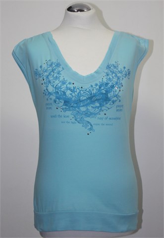 Tom Tailor majica bez rukava, tirkizno plave boje sa prednjim printom i aplikacijama. Nabrana na ramenima, stegnuta na dnu pasice. Mekan i blago rastezljiv pamuk.