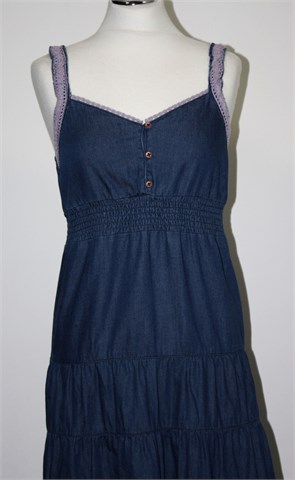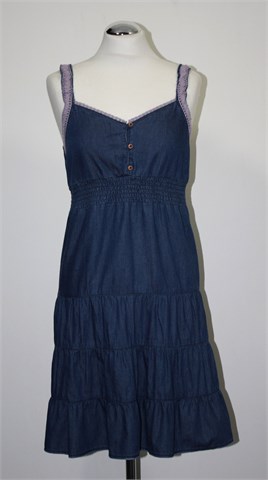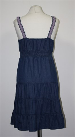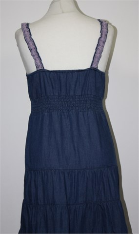 Tom Tailor traper haljina bez rukava, srednje plave boje. Tanke fiksne naramenice (rastezljive i ukrašene heklanom trakicom), ispod prsiju prošivena gumicama pa je širina rastezljiva (i sa stražnje strane). Lagan i tanji pamuk, u gornjem dijelu dupli materijal.