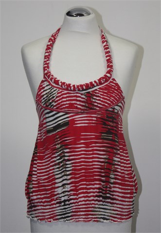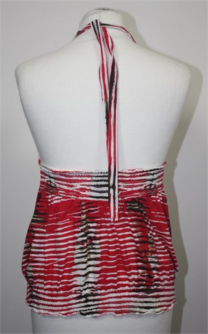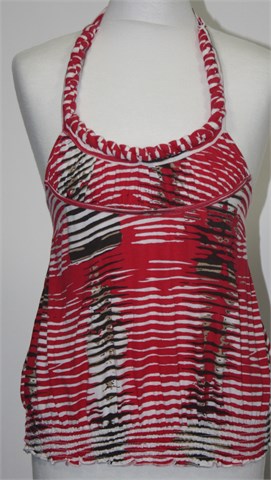 Tommy Hilfiger topić crvene boje sa printom (boje i uzorak kao na slikama). Prošivena gumicama na leđima i na dnu pasice (prilagodljiva širina), pletena na dijelu koji se veže oko vrata (leđa su otvorena). Mekan, tanji i rastezljiv materijal.