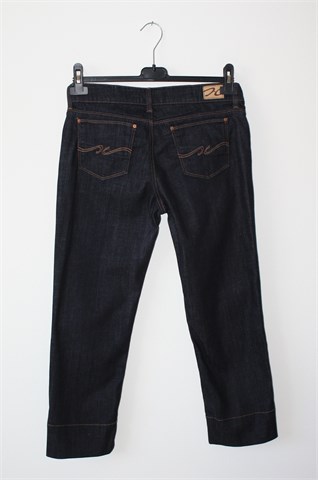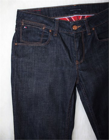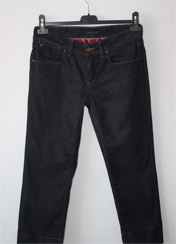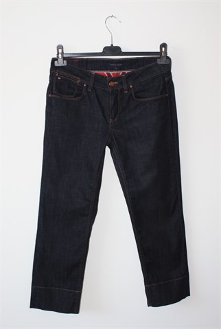 Tommy Hilfiger traper hlače tamno plave boje, nisu skroz dugačke (vidjeti mjeru za dužinu - capri). Prednji cif i kopčanje, pasica za remen. Prednji i stražnji klasični džepovi, blago rastezljive. Nogavice se mogu nositi podvinute ili otpuštene (kao na slikama).