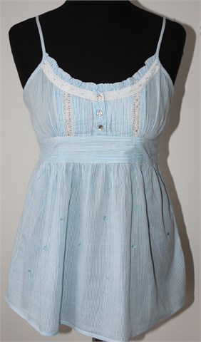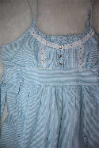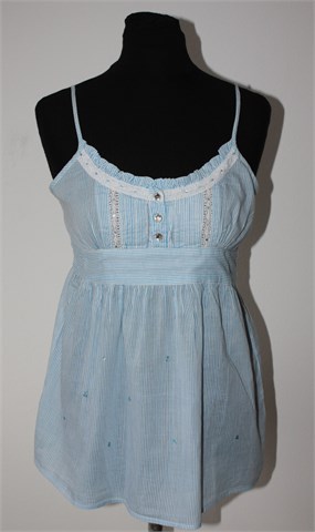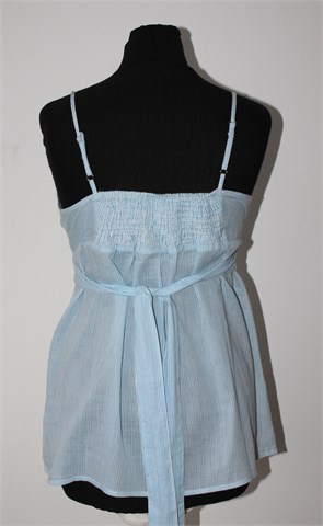 Topić bijele boje sa plavim prugama, mjestimično ukrašen perlicama i heklanim trakicama. Bočne trake za vezanje, naramenice su podesive. Sa stražnje strane prošivena gumicama (žabice) pa je širina prilagodljiva. Tanji i lagan pamuk.