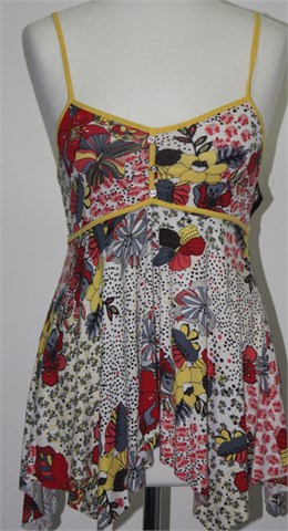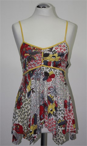 SP Fashion topić bijele boje sa šarenim printom (boje i uzorci kao na slikama). Rezan ispod prsiju, prema dolje se blago širi (rubovi su asimetrični). Bočne trake za vezanje. Mekan i rastezljiv materijal.