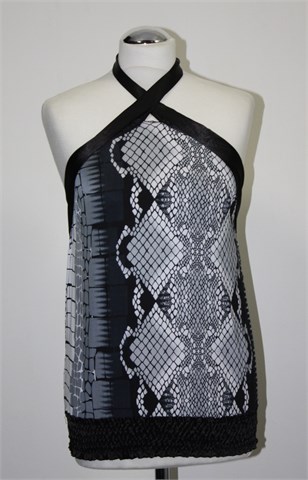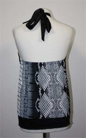 Topić crno-bijelo-sive boje s uzorkom (kao na slici). Vezanje sa trakama oko vrata, leđa su otvorena. U pasici je stegnuta gumicama i na leđima je prošivena gumica pa je širina prilagodljiva. Tanak i rastezljiv materijal.