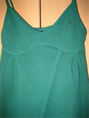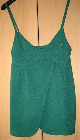 Neobičan topić. Podesive naramenice kao na grudnjaku. Na prsima ukrasi od cirkona. Donji dio djeluje kao da je na preklop i širi se kao tunika. Vrlo lagan i blago proziran topić. Dosta rastezljiv. Djeluje kao pleteni.