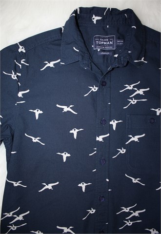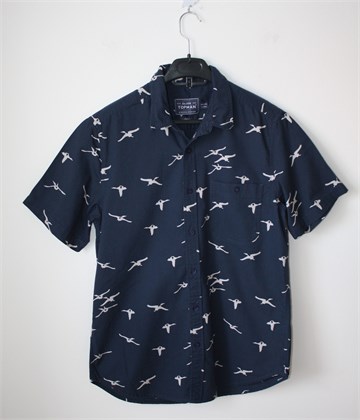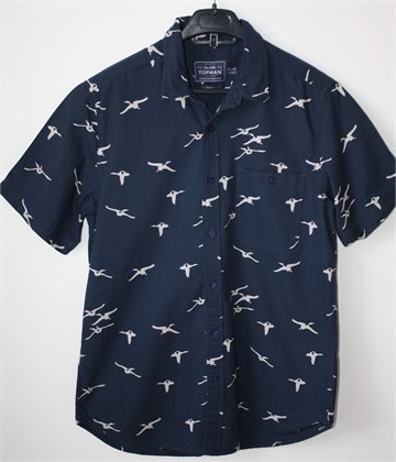 Topman košulja tamno plave boje sa printom (uzorak printa vidljiv na slikama). Prednje kopčanje, džepić na prsima. Deblji i nerastezljiv pamuk.