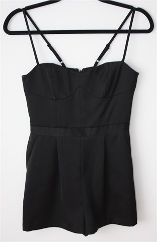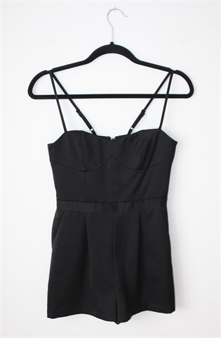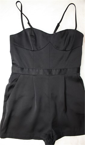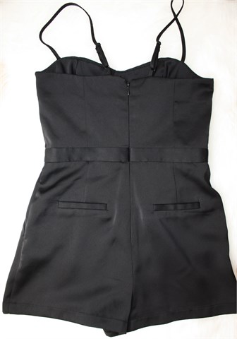 Topshop Petite kombinezon crne boje. Tanke podesive naramenice, kratke hlačice. Prednji bočni, stražnji ukrasni džepovi, stražnji cif. Gornji dio je podstavljen. Materijal je blago sjajan i nije rastezljiv.