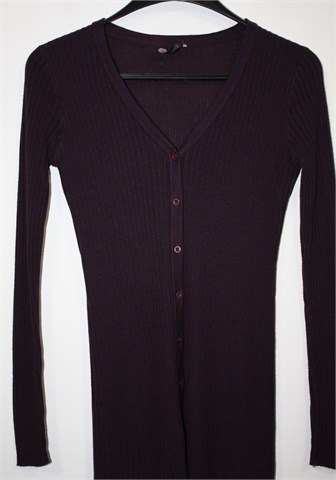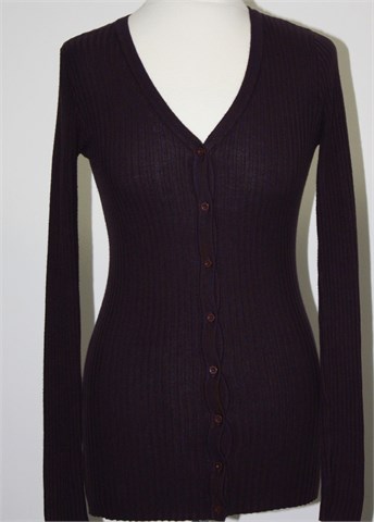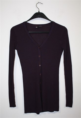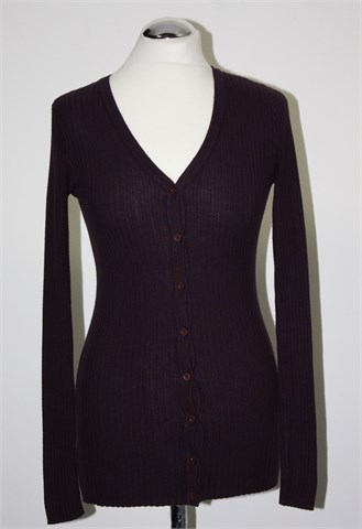 Topshop vesta na kopčanje/kardigan prošarano tamno ljubičasto-smeđe boje. Prednje kopčanje, rebrasto pletivo. Tanja, mekana i rastezljiva.