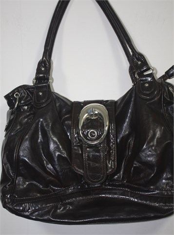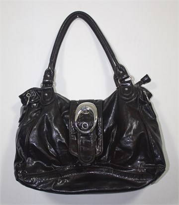 Ženska torbica većih dimenzija, prošarano tamnije smeđe boje. Glavni pretinac je podijeljen na dva dijela + dodatni bočni džepići, zatvara se sa cifom i preklapa ukrasnom kopčom.