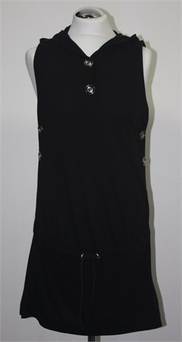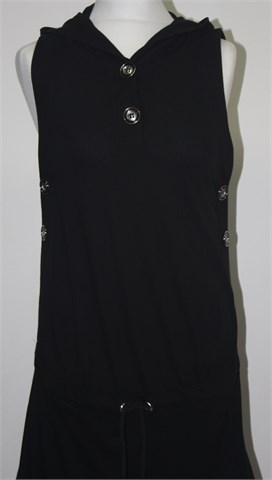 Trafaluc (Zara) duža majica/tunika bez rukava, crne boje sa kapuljačom. U struku se može stegnuti sa vezicom, prednji i bočni ukrasni gumbi. Ugodan i rastezljiv pamuk.