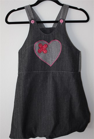 Šivana i unikatna traper haljina bez rukava, sivo-plave boje, materijal je blago sjajan. Našiveno srce-aplikacija sa prednje strane (ispod je džepić), naramenice na kopčanje sa ukrasnim gumbićem. Pufasti kroj, blago rastezljiva.