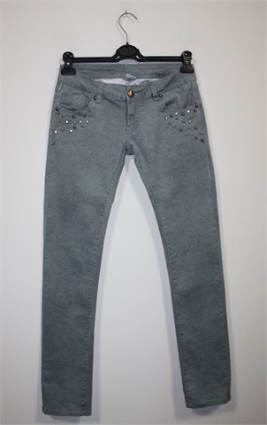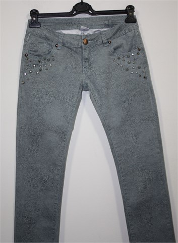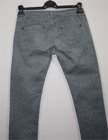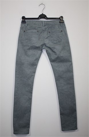 Traper hlače blijedo svijetlo plave boje sa crnim printom/uzorkom (kao na slikama). Prednji cif i kopčanje, pasica za remen. Prednji i stražnji klasični džepovi. Ukrasni drukeri sa prednje strane. Rastezljive, tanji traper (plići model - vidjeti mjere).