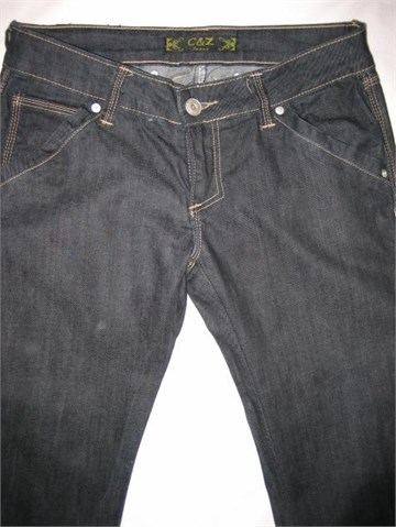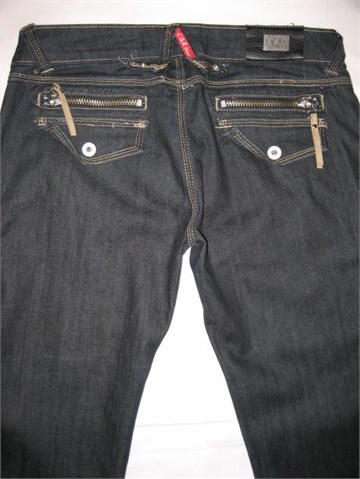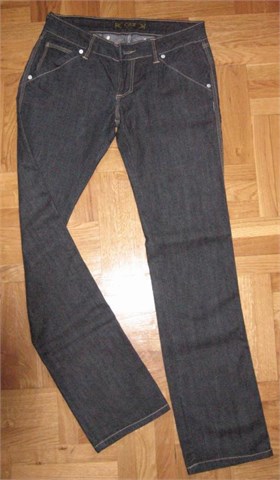 Niski struk. Ravne nogavice. Ukrasni džepovi sa cifom sa stražnje strane. Prednji džepovi koso rezani. Blago rastezljive.