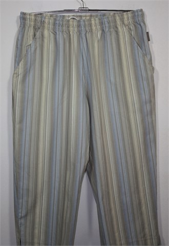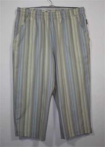 Trigema poluduge pamučne hlače u prugastoj kombinaciji svijetlih boja (boje kao na slikama). Gumica i vezica u struku (prilagodljiva širina - vidjeti mjere), bočni džepovi. Mali bočni rasporci na nogavicama.