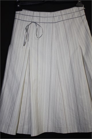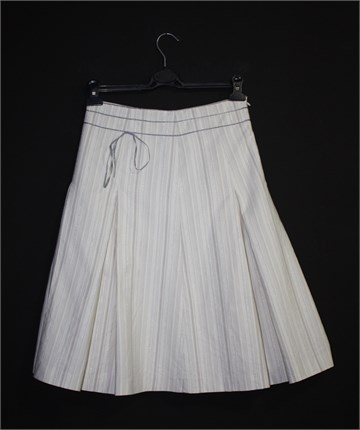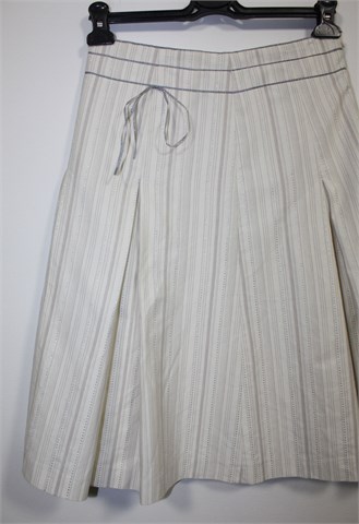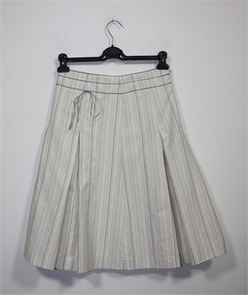 Trucco suknja prljavo bijele boje sa sivim i srebrnim prugama. Falde sa prednje i stražnje strane, u gornjem dijelu prošivena sivo-srebrnkastim trakicama - jedna se veže sa prednje strane. Bočni cif, podstavljena pamučnom podstavom. Deblji i kvalitetan materijal.