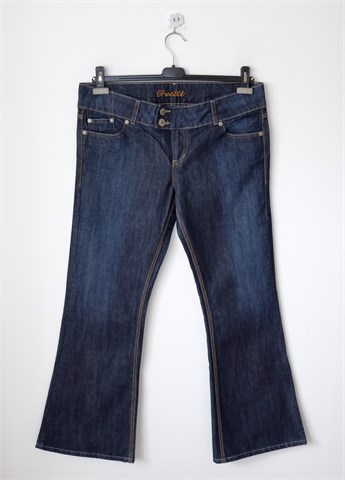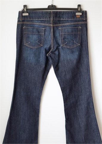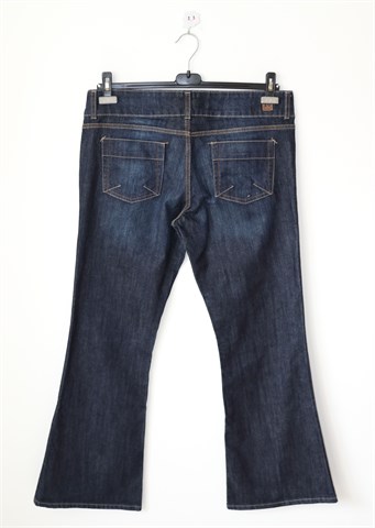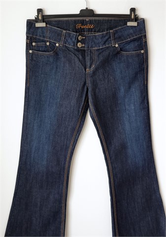 True2U traper hlače tamno plave boje, mjestimično ispranog izgleda (tvornički used look). Prednji cif i gumbi, pasica za remen. Prednji i stražnji džepovi. Blago rastezljive.