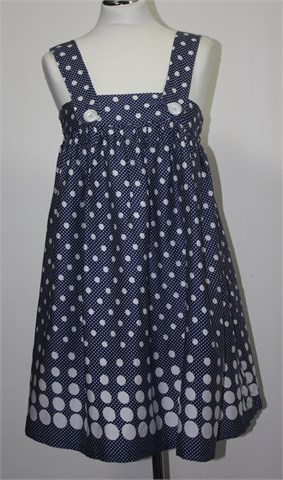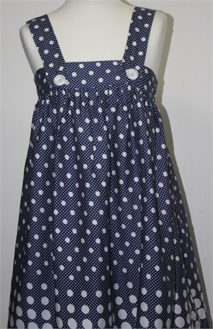 Kratka haljina ili tunika, tamno plave boje sa bijelim točkicama. Tanke naramenice (koje se kopčaju sa gumbom), sa stražnje strane rastezljiva (ušivene "žabice" kroz materijal). Širi model.