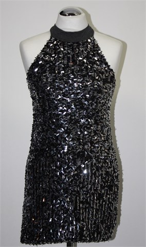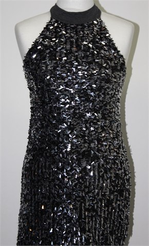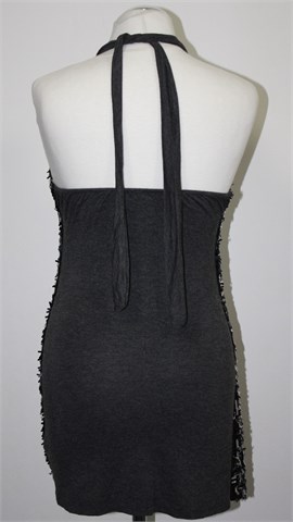 Tunika bez rukava, sive boje. Sa prednje strane su našivene šljokice/aplikacije, sa stražnje strane nisu. Vezanje oko vrata, leđa su otvorena. Prednja strana je podstavljena, na leđima je ušivena gumica (mrvicu se odšio šav na gumici ali lako se zašije).