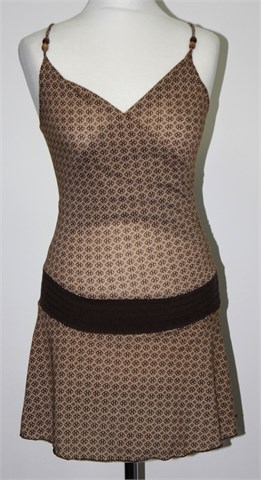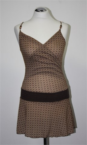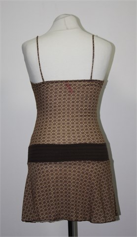Tunika bez rukava prljavo bijelo-bež boje sa smeđim printom. Tanke, fiksne naramenice sa ukrasnim drvenim kuglicama, Prošivena gumicama u struku, gumica ušivena u stražnji gornji šav pa je širina prilagodljiva (prednja strana sa fiksnim preklopom). Lagan, tanji i rastezljiv materijal.
