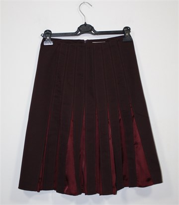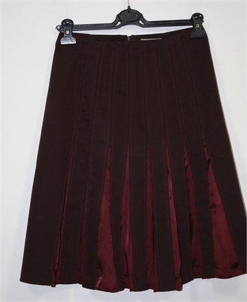Turnover suknja neobične bordo-zagasito ljubičaste boje, sa prednje strane ukrasni prošivi i falde sa umetcima od sjajne i svilenkaste bordo tkanine (vidljivo na slici). Sa stražnje strane mali rasporak sa umetkom od istog materijala kao i na prednjoj strani. Stražnji cif, podstavljena.