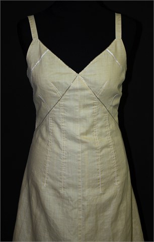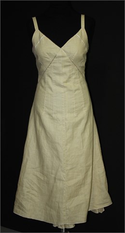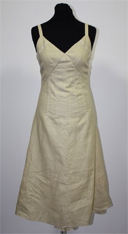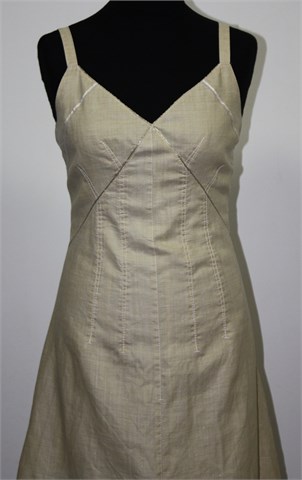 Tuzzi prekrasna haljina bež boje sa zlaćanim sjajem na materijalu. Prošivena bijelim koncem, našivene ukrasne trake bijele i zlatne boje. Tanke i fiksne naramenice, prednji i stražnji ušitci (strukirana). Stražnji cif, podstavljena (na dnu podstave našiven je volančić). Prekrasan, čvrst ali lagan materijal (kao čvrsti lan).
