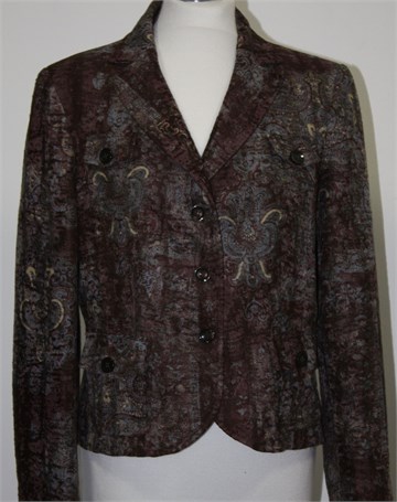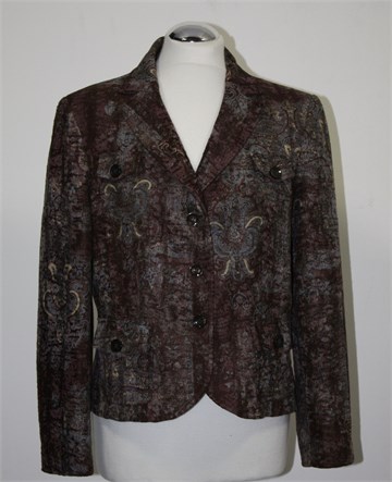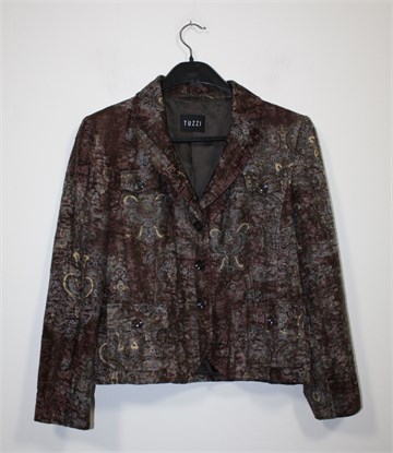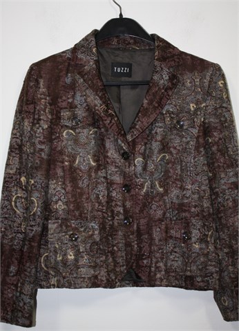 Tuzzi sako (ili jaknica) smeđe boje sa šarenim uzorkom/printom (boje i uzorci kao na slikama). Prednje kopčanje, ukrasni džepići na prsima (samo preklop sa gumbom) i bočni džepovi sa preklopom i gumbom. Jastučići u ramenima, podstavljen. Vanjski materijal je blago reljefast.