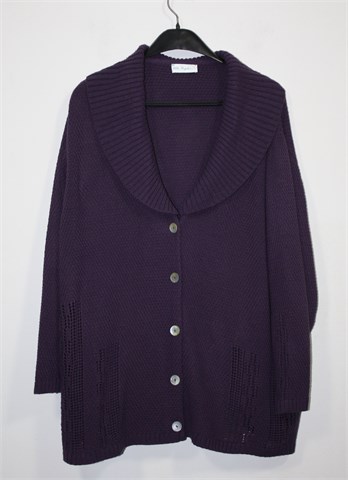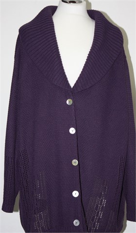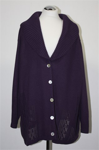 Ulla Popken vesta na kopčanje/kardigan zagasito ljubičaste boje. Prednje kopčanje sa ukrasnim sedefastim gumbima, rukavi nisu skroz dugački (vidjeti mjeru). Lagano i rastezljivo pletivo, mjestimično rupičasto.