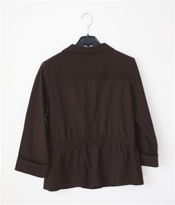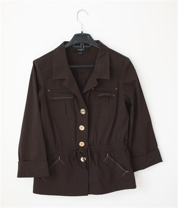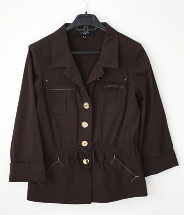 Un Ailleurs Jour jakna sa poludugim rukavima, tamno smeđe boje. Prednje kopčanje sa zlatnim gumbima, džepići sa preklopom na prsima, bočni kosi džepovi. U struku vezice (po želji se mogu stegnuti), jastučići u ramenima (mogu se odšiti). Tanja, lagana i rastezljiva.