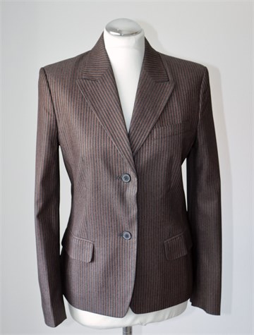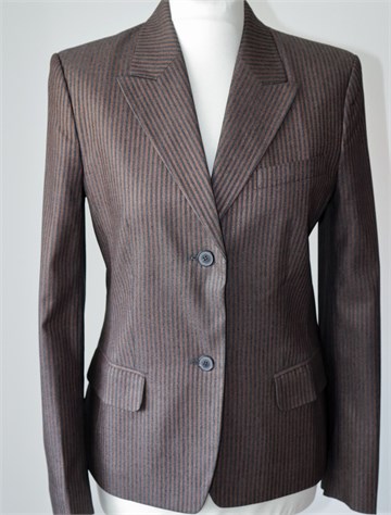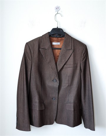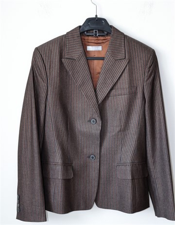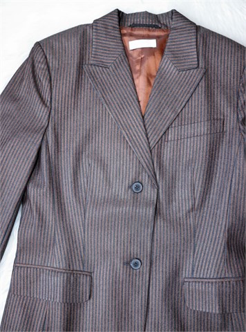 Uncovered sako/blazer u prugastoj kombinaciji crne i brončane boje (blago sjajan materijal). Prednje kopčanje, bočni džepovi sa preklopom. Blagi jastučići u ramenima, podstavljen. Blago rastezljiv.
