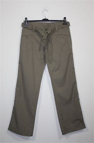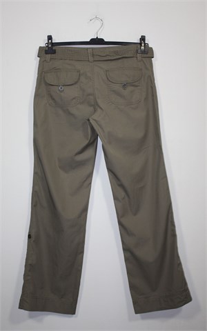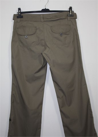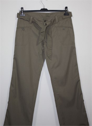 Urban Basics (TCM) casual hlače, svijetlo maslinasto-smeđe boje. Prednji cif i kopčanje, pasica za remen sa pripadajućim remenom (može se izvaditi). Prednji bočni, stražnji džepovi sa preklopom i gumbom. Šire nogavice, lagan i prozračan pamuk. Mogu se nositi i kao poluduge hlače.