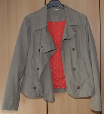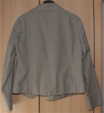 Proljetno/jesenska jaknica bež boje. Prednje bočno kopčanje, bočni džepići. Podstava narančaste boje sa bijelim točkicama. Piše veličina 42 (vidjeti mjere).