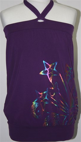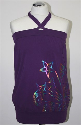 Urban Republic topić/majica bez rukava ljubičaste boje sa prednjim šarenim printom (uživo je boja više zagasito ljubičasta). Vezanje oko vrata, stegnut pasicom pri dnu. Mekan i rastezljiv materijal.