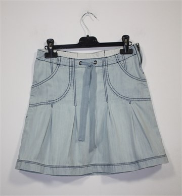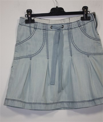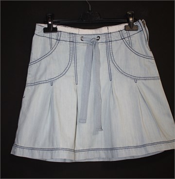 Urban Republic traper suknja svijetlo plave boje, mjestimično ispranog izgleda (used look). Prednji bočni džepovi, vezice u pasici. Falde sa prednje i stražnje strane, bočni cif. Tanji traper.