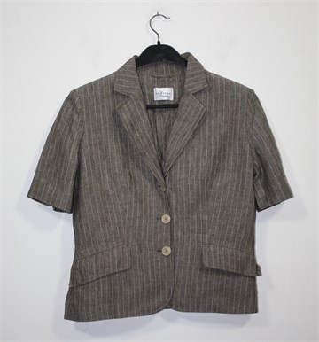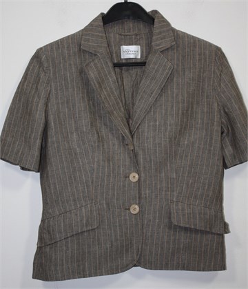 Varteks sako od lana prošarano smeđe boje sa svijetlo smeđe-bež prugama. Kratki rukavi, prednje kopčanje i bočni džepovi sa preklopom (još uvijek zašiveni). Jastučići u ramenima, podstavljen.