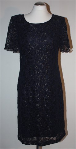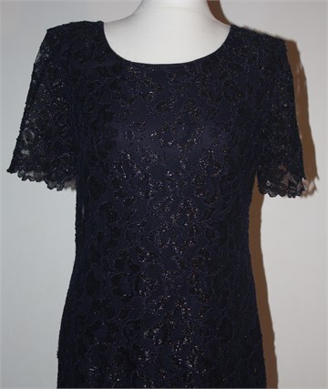 Vera Mont haljina od čipke (mrežasti til sa čipkastim uzorkom) tamno plave boje, protkana sjajnim nitima. Podstavljena (osim rukava), stražnji cif. Blago rastezljiv materijal.