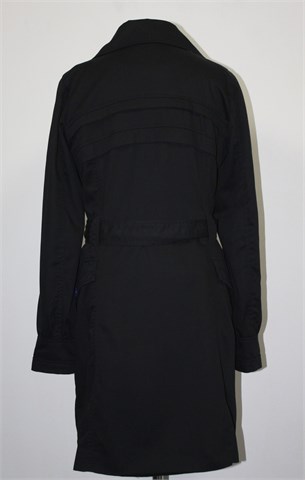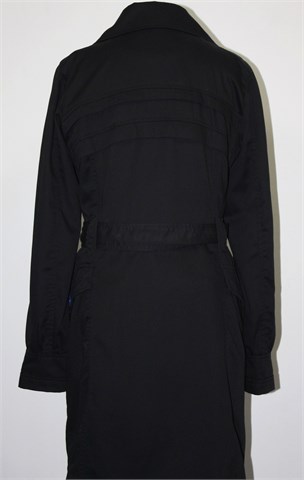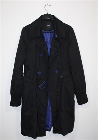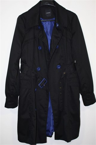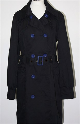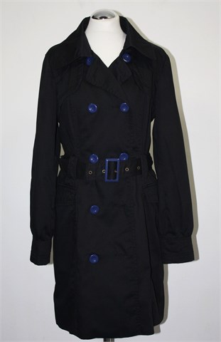 Vero Moda baloner/jakna crne boje sa detaljima u plavoj boji (gumbi i kopča remena). Prednje kopčanje (dva gumba su se odšila ali za unutarnju etiketu je ušivena vrečica sa rezervnim gumbima pa se lako zašiju), ušice za remen sa pripadajućim remenom (može se skinuti). Bočni džepovi sa preklopom i gumbom, ukrasni prošivi na leđima i ramenima. Podstavljen.