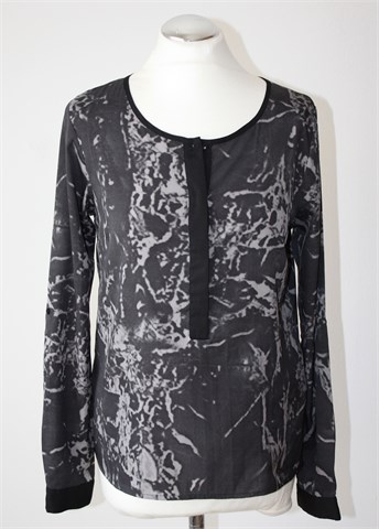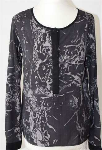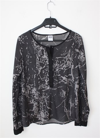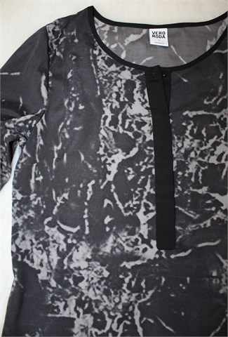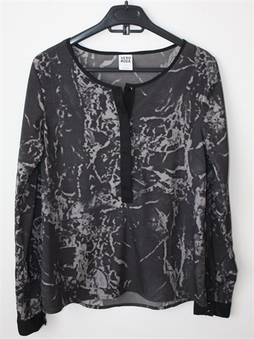 Vero Moda bluza sa dugim rukavima (mogu se nositi i kao kraći - gumbić sa vanjske strane rukava i vezica unutar rukava), crno-sive boje sa printom/uzorkom na materijalu (vidljivo na slikama). Prednji skriveni gumbići (osim prvog), gumbići na kraju svakog rukava. Tanja i lagana, vrlo blago rastezljiva.