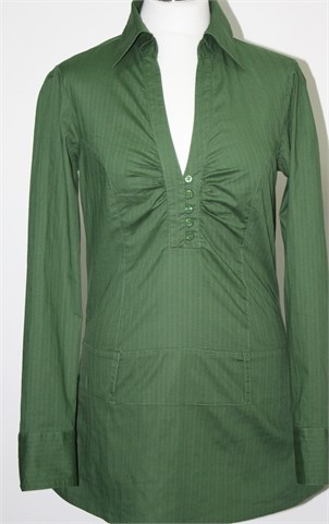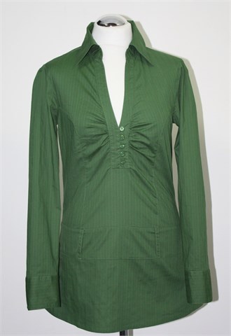 Vero moda tunika sa dugim rukavima, zelene boje sa diskretnim prugama. Prednje kopčanje, ušitci na prsima. Pasica sa ušitcima za remen (bez remena). Blago rastezljiv materijal.