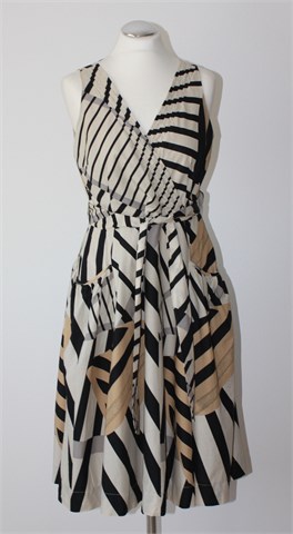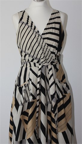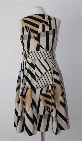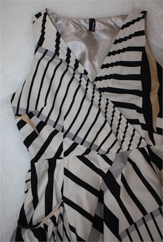 Vero Moda haljina bez rukava, sivo-bež boje sa printom (boje i uzorak printa vidljiv na slikama). Prednji fiskni preklop (zašivena da se ne rastvara), rezana u visokom struku i prema dnu se širi. Bočne trake za vezanje, bočni džepovi na dijelu suknje. Bočni cif, cijela podstavljena.