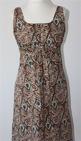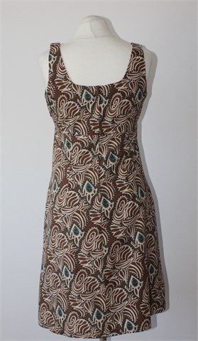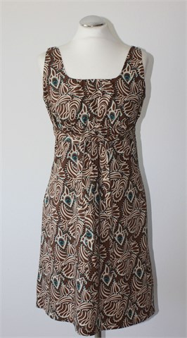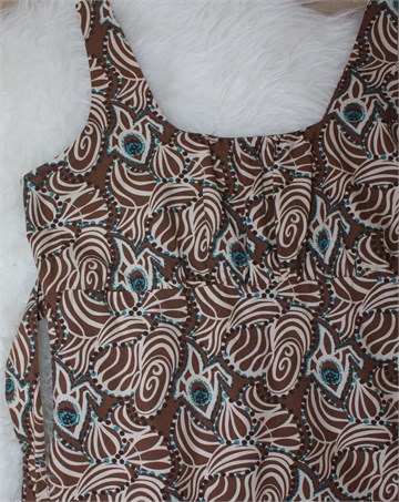 Vero Moda haljina bez rukava, smeđe boje sa printom (boje i uzorak printa kao na slikama). Blago nabrani materijal na prsima, bočne trake za vezanje (vežu se sa prednje ili stražnje strane). Stražnji skriveni cif, podstavljena pamučnom podstavom. Nije rastezljiva.