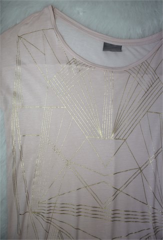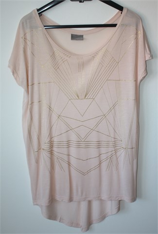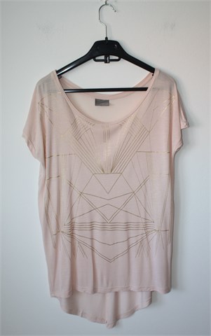 Vero moda majica/tunika sa kratkim rukavima, nude-roze boje sa prednjim zlatnim printom (vidljivo na slikama). Duža sa stražnje strane (vidjeti mjere). Tanja, mekana i rastezljiva.