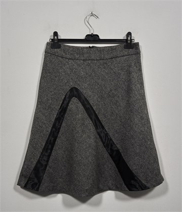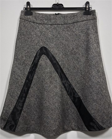 Vero Moda suknja prošarano crno-bijele boje (djeluje sivo), satenska aplikacija sa prednje strane (vidljivo na slici). Stražnji cif i gumbić, podstavljena.
