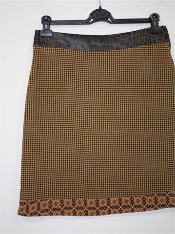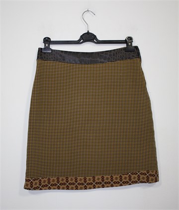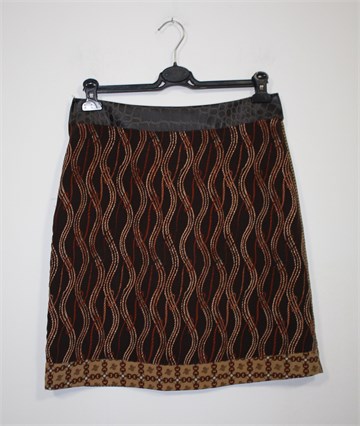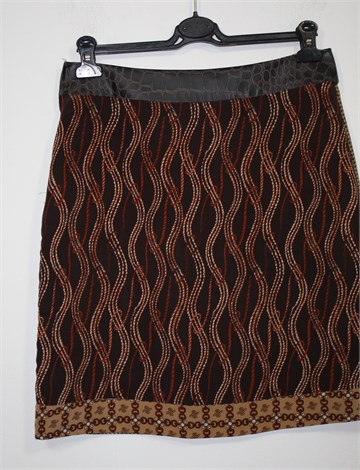 Vero Moda suknja u kombinaciji smeđe-bež boje sa uzorcima (prednja i stražnja strana suknje imaju različite uzorke). Pasica je od umjetne kroko kože smeđe boje. Bočni cif, podstavljena. Lagana i tanja.