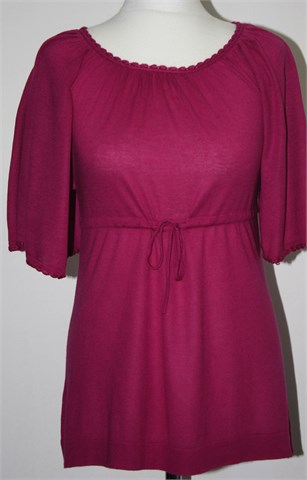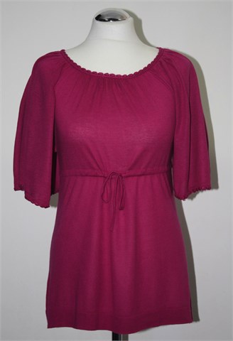 Vero moda duža vestica ili tunika, zagasitije ciklama roze boje (nije drečava boja). Rukavi su nešto između poludugih i kratkih i dosta su široki. Ispod prsiju je rezana i ima provedenu špagicu koja se može zategnuti. Lagano, mekano i rastezljivo pletivo.
