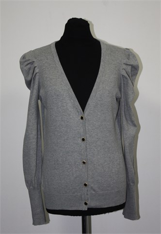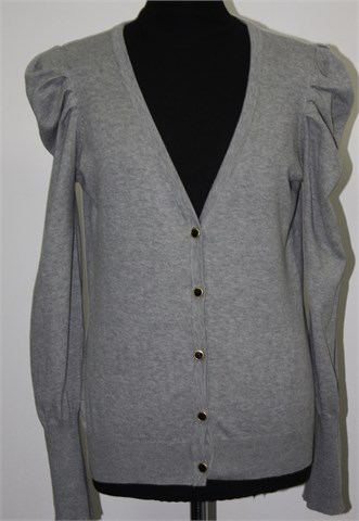 Vero Moda vesta/kardigan sa dugim rukavima, prošarano sive boje. Prednje kopčanje sa ukrasnim gumbima, puf rukavići. Tanje, mekano i rastezljivo pletivo.