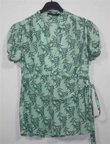 Vero moda svilenkasta bluza, zelene boje s uzorkom. Kratki rukavi, bočne trake za vezanje. Lagan materijal, svilenkast na dodir.