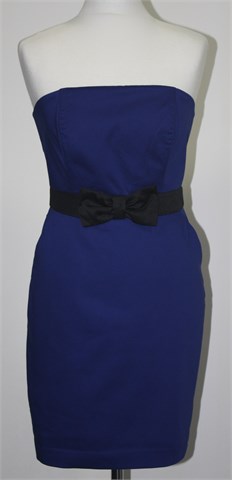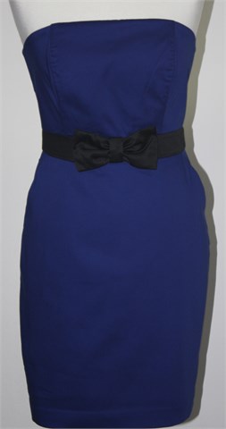 Vero Moda haljina plave boje (točan naziv boje na etiketi je electric blue) sa crnom blago sjajnom trakom i mašnicom u struku. Haljina nema naramenice, cijeli gornji dio haljine je obrubljen u silikonski rub tako da haljina ne kliže. Dugački stražnji cif sa gumbićem. U gornjem dijelu plastične žice koje sve drže na mjestu :) Haljina je podstavljena i ima bočne džepove.
